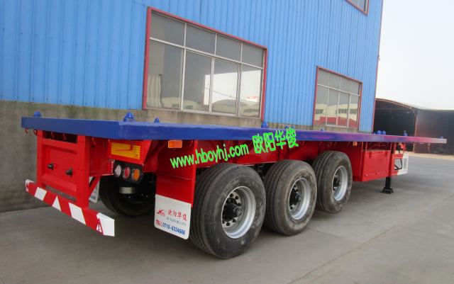 2臺漂亮的出口40尺平板半掛車大概配置為:BPW13T單胎車軸帶ABS,華勁空氣懸掛(前軸可提升),平板上帶12個集裝箱旋鎖,方便集裝箱裝卸使用。此兩臺半掛車一起運上海碼頭出口裝船運走。感謝進出口有限公司對歐陽華俊的支持,祝您們猴年生意興隆,財源廣進!《湖北歐陽華俊專用汽車有限公司歡迎您!》