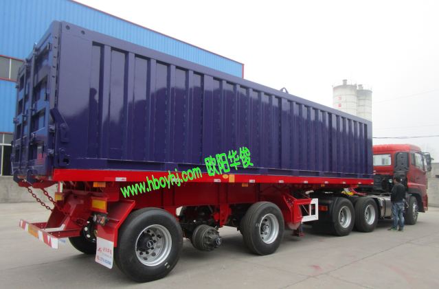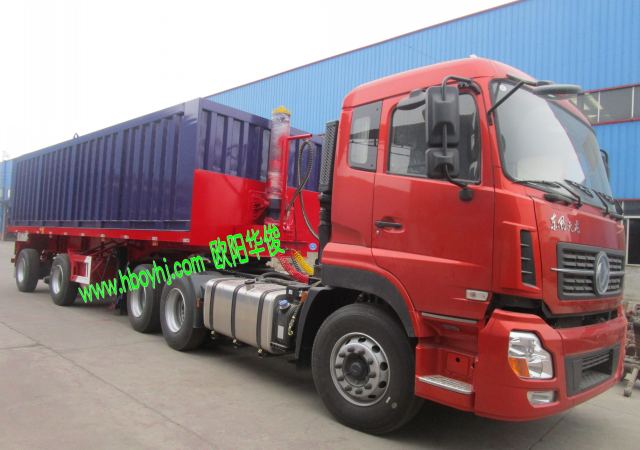 藍色集裝箱平板后翻自卸半掛車-歐陽華俊交車