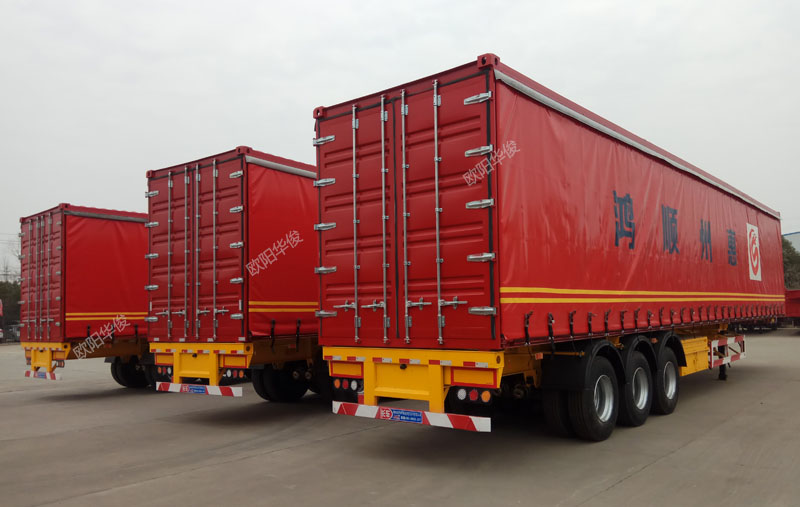 3臺骨架半掛車配直梁式側簾篷布廂式半掛車完工交付給客戶張總,骨架半掛車顏色為工程黃,篷布側簾車廂為紅色。此骨架半掛車的尺寸為:13.95米長×2.5米寬;上裝篷布車廂尺寸為:15.2米長×2.6米寬×2.75米內高。后門為廂式對開門,廂體內打井字形隔開,每邊焊15個臥環。該車廂曾經成為國外公路貨物運輸中的主導車型,也是當前廂式運輸車開展的一大趨向。