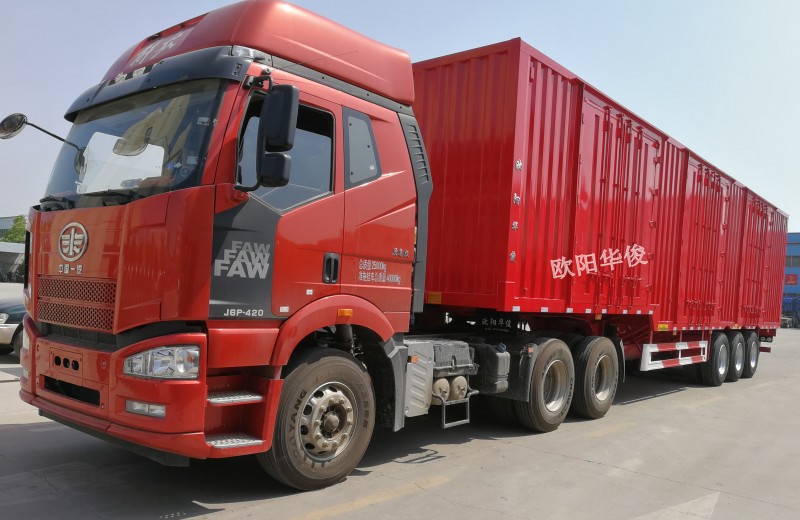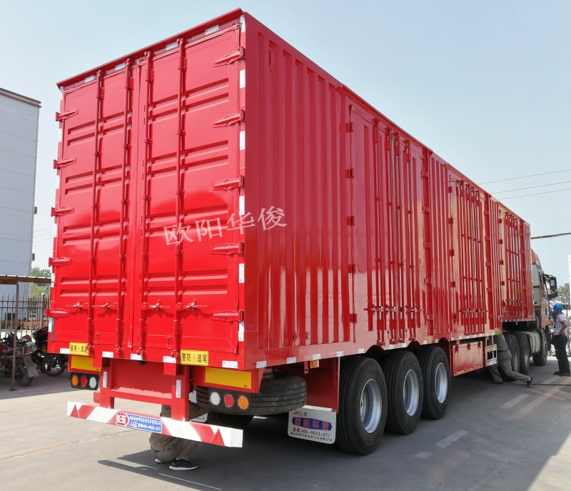 廂式集裝箱半掛車采用優質鋼材,先進的技術,嚴格的生產工藝制造而成,整車結構合理,性能可靠,操縱簡便,外型美觀。每邊對開門可按客戶要求進行設計制作,滿足用戶多樣化、個性化要求。采用封閉式側防護設計,有效減少車輛高速行駛時橫向風險,減低能耗。歐陽華俊可以按照客戶拉貨的實際需求定制生產,保質保量,熱忱歡迎各物流公司考察、下單!