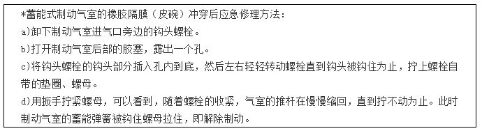 ②在制動狀態檢查制動氣室有無漏氣,在卡箍處涂抹肥皂水,檢查有無漏氣,若漏氣時應擰緊卡箍夾緊螺母,擰緊力矩為30N.m。檢查前面的放泄孔有無漏氣,若漏氣則應更換橡膠隔膜。檢查外部有無裂紋和損傷,必要時更換整個制動氣室。