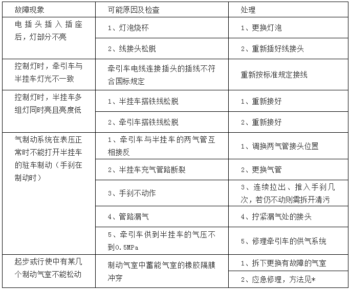 起步、行使半掛車出現故障,可按下表檢查與處理: