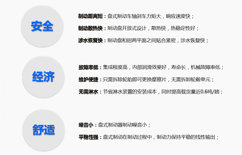 盤式制動器的散熱性、抗熱衰退性都好于鼓式制動器,但面對山區的長下坡路段,依然會有溫度過高制動性能衰退的現象。并且盤式制動器的制動盤直接裸露在外,不能澆水(一旦澆水會降低摩擦性能,甚至會使制動盤激冷開裂),因此,如果掛車配備盤式制動器的話,牽引車需配備液力緩速器。